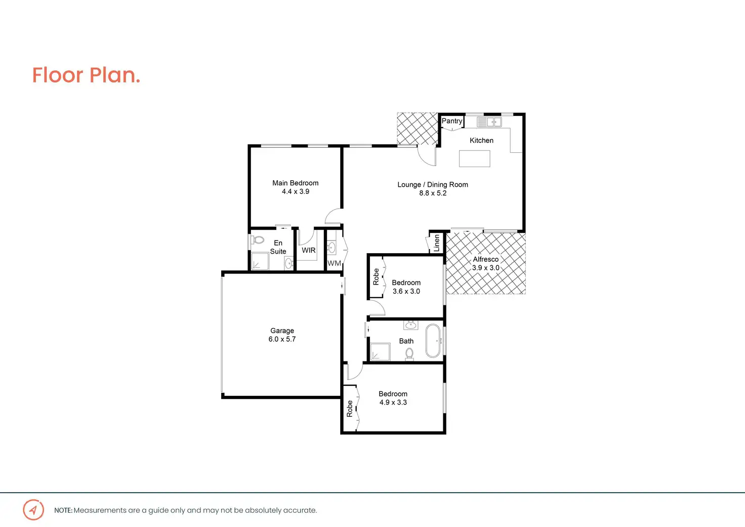 Featuring three generous bedrooms, each with plush carpet and privacy blinds and bedrooms two and three equipped with built-in robes. While the master bedroom offers a walk-in robe and private modern ensuite. In addition, a sleek main bathroom with modern tiles, a floating single vanity, and a large bathtub complete the inside space.