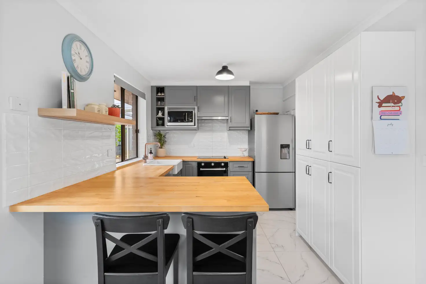 As you enter the property, you'll be welcomed into a generous living area with stunning marble-look 600mm x 600mm tiles and plenty of natural light. This open and airy space overlooks the front yard, creating a warm and inviting atmosphere. The living area flows seamlessly into the dining and kitchen space, which was renovated just five years ago. The kitchen features a farmhouse sink and a timber bench top that adds a touch of warmth and character to the space, making it the perfect spot to gather with family and friends.