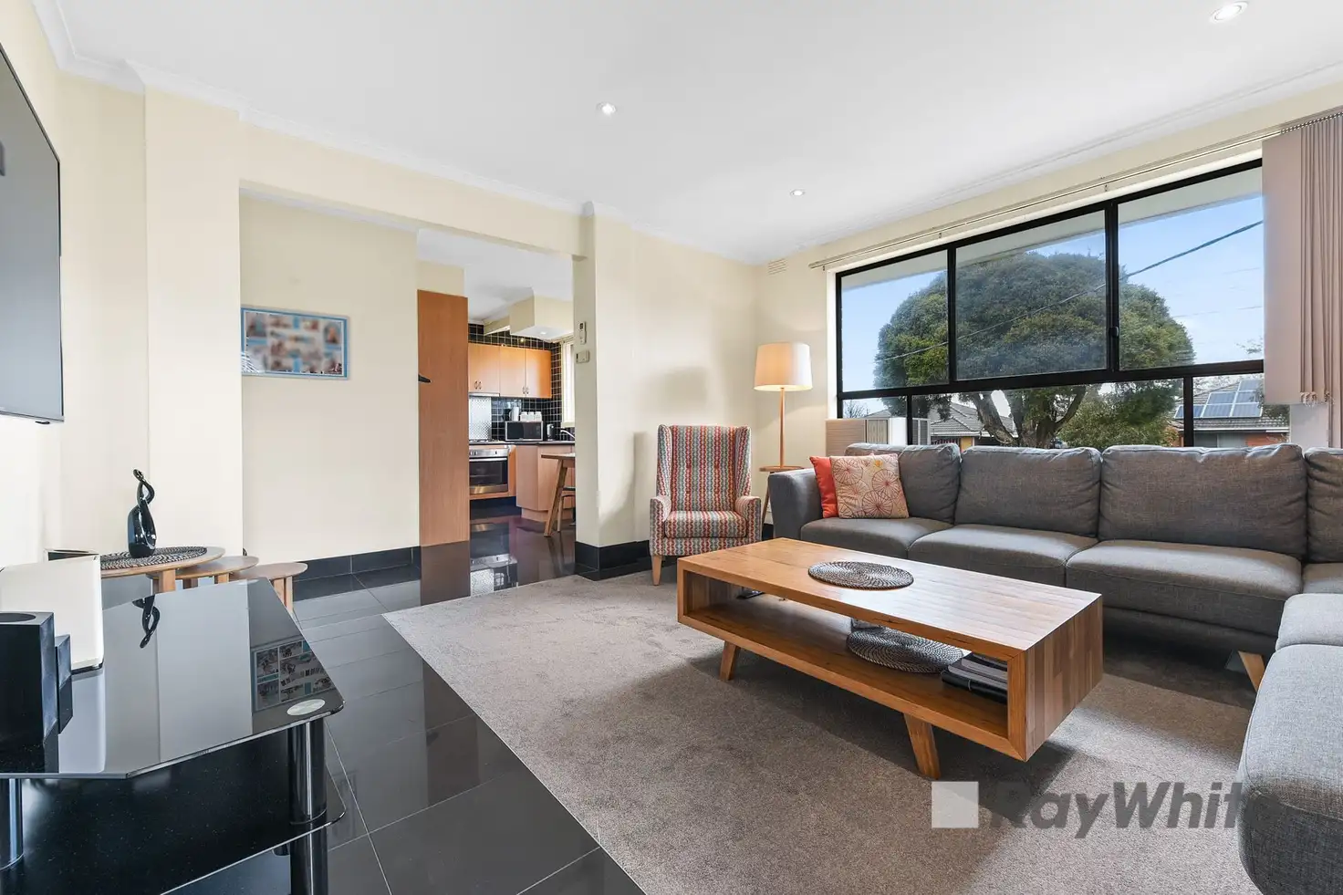 Upon entry you are welcomed by a spacious living space featuring plenty of natural light, situated on newly laid carpet surrounded by contemporary dark tiles throughout. The dining/meals area is adjacent to the delightful renovated kitchen featuring gas cooking, electric oven, double sink, tiled splashback reaching to the ceiling and an ample cupboard space. There are two spacious bedrooms, both offering built in robes and freshly laid carpet. The main fully renovated bathroom and laundry room offers the ultimate convenience with plenty of space, the separate toilet and linen storage closet complete the interior of this lovely home.