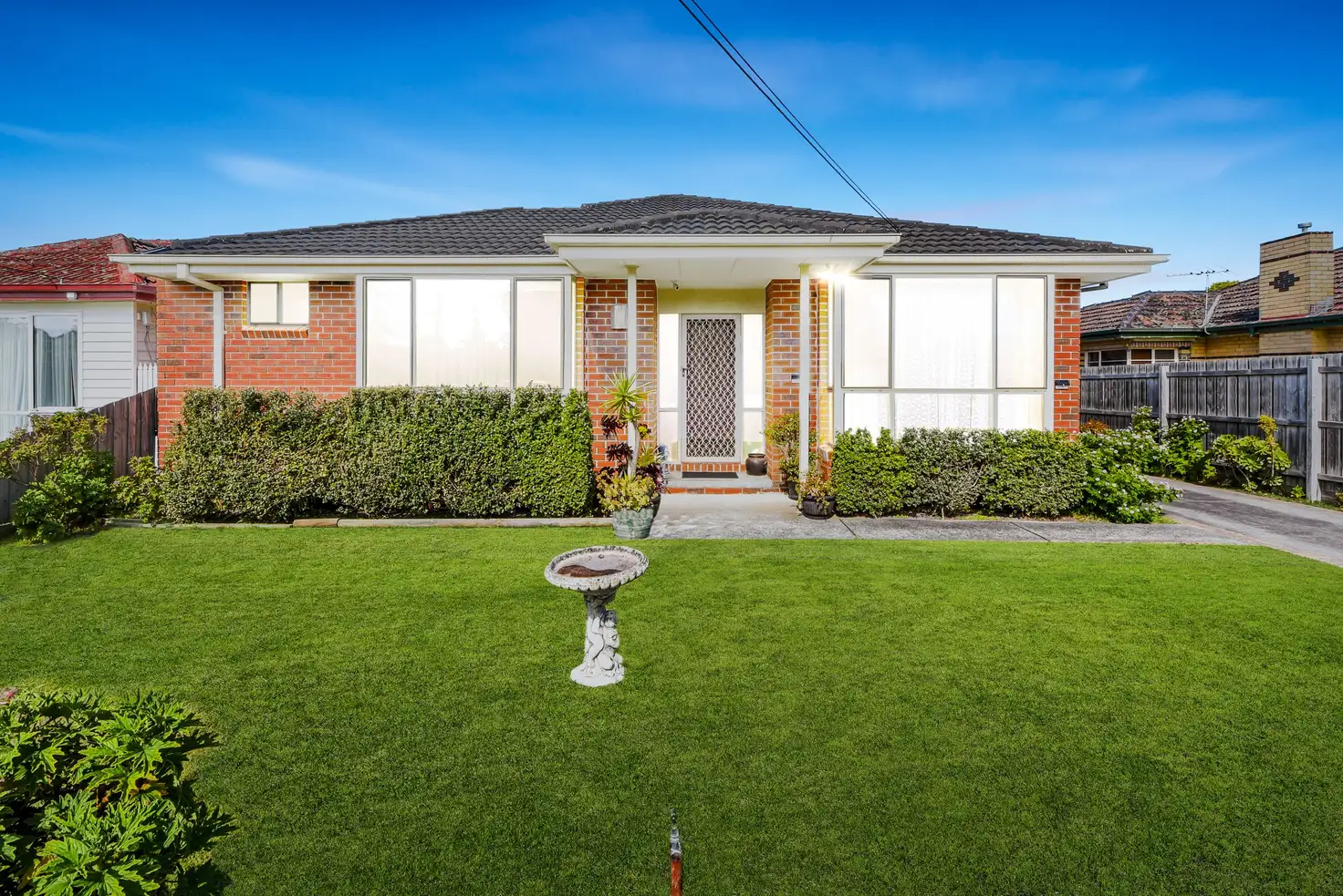 Benefiting from a generous street frontage, the home rests behind decorative picket fencing, showcasing a classic red-brick facade that's framed by a neatly manicured lawn and pops of flourishing greenery.