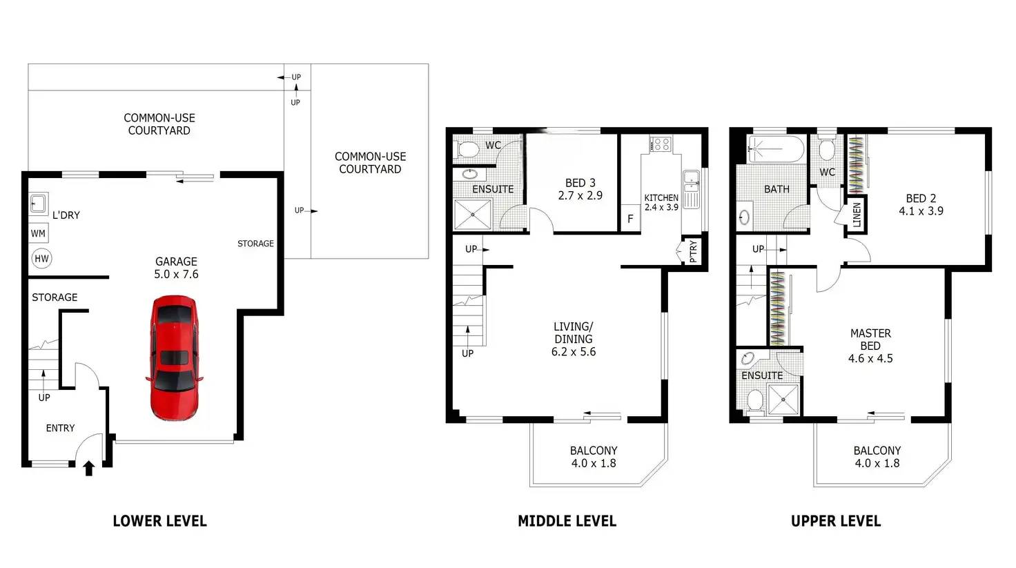 • Third floor hosts second + main bedrooms both with built-in robes – master suite inc. a private ensuite & balcony
