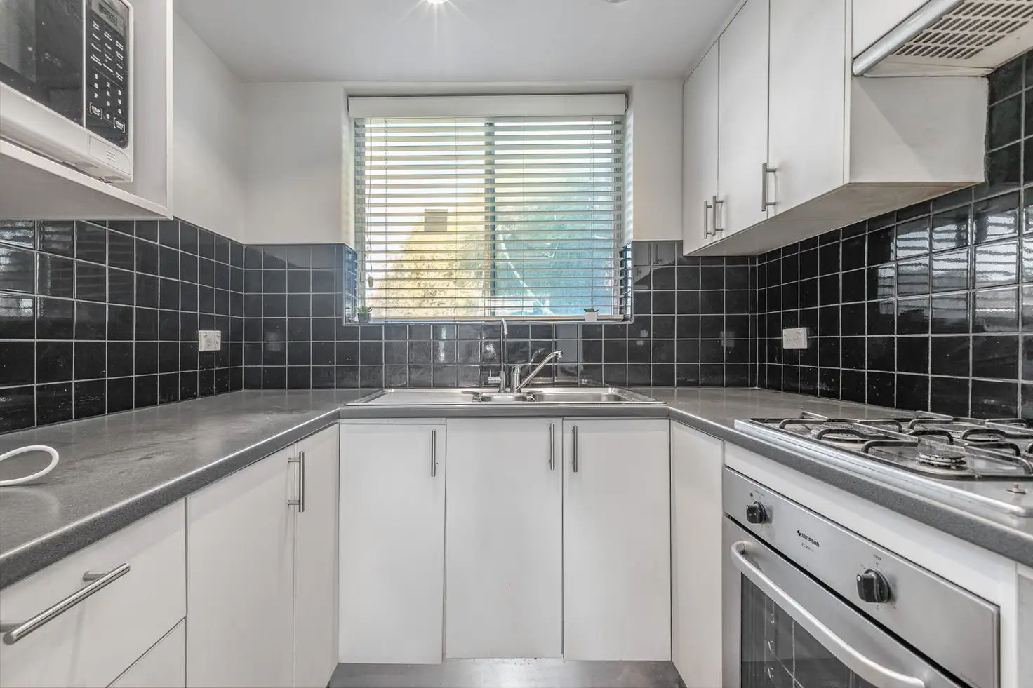 Renovated kitchen with stainless steel oven and cooktop, complemented with ample cupboard space;