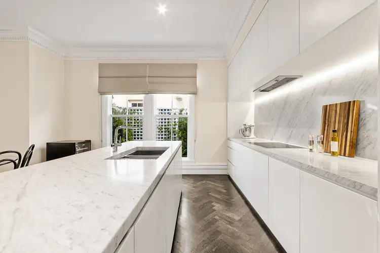 Beyond a secure streetfront entrance anchored by majestic palms, discover a supersized formal living room exuding a genuine feeling of warmth and inclusion. Roomy and relaxed open-plan living and dining is crafted with effortless flow, underscored by a high-end Miele-equipped kitchen with an integrated dishwasher, microwave, and an easy-clean induction cooktop. This wonderful workspace is further enhanced by marble finishes and an imposing waterfall-edged island bench for efficient preparation and presentation.