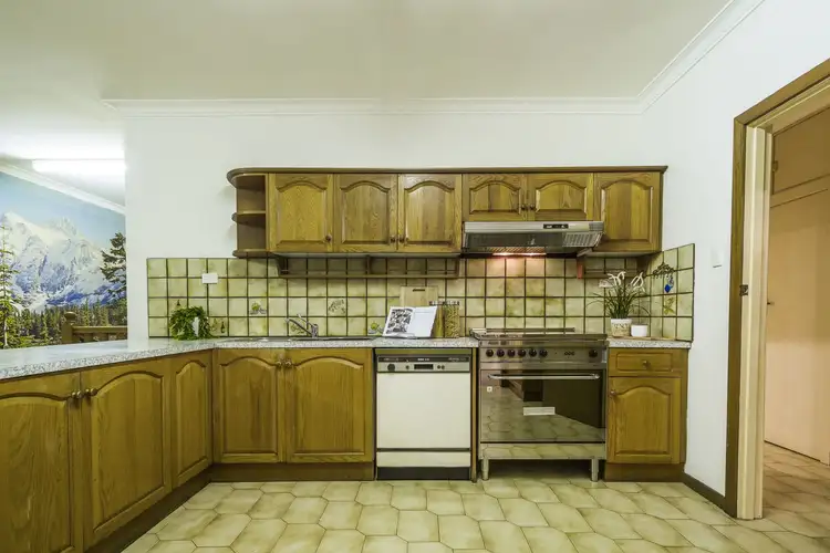 An open plan dining space and large timber kitchen, with stainless steel 900mm Lofra dual fuel cooker, forms the hub of the home and offers scope for modernisation.