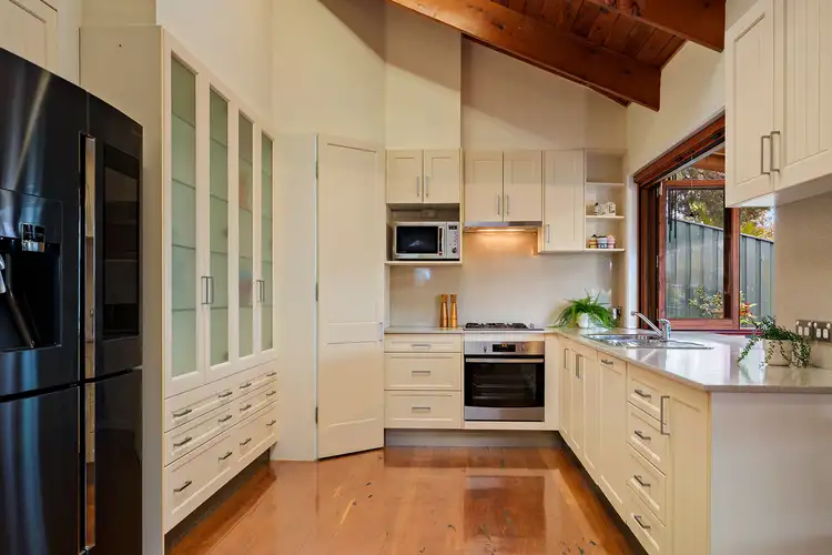 Head down four short steps to be dazzled by the open plan kitchen, dining and living area. Four meter high vaulted timber ceilings, an exposed brick wall and polished timber flooring, only add to the classic elegance felt when you enter the home. The living room is air-conditioned, making it a pleasant environment with great ambiance. The heart of the home is within your stylish kitchen; finished with attractive Caesar stone countertops and splashbacks, plumbed fridge space, quality stainless steel appliances including Westinghouse gas cooktop, oven and integrated dishwasher, and ample cupboard storage space. Thoughtfully designed with bi-folding glass windows which double as an external breakfast bar or servery for an outdoor experience.