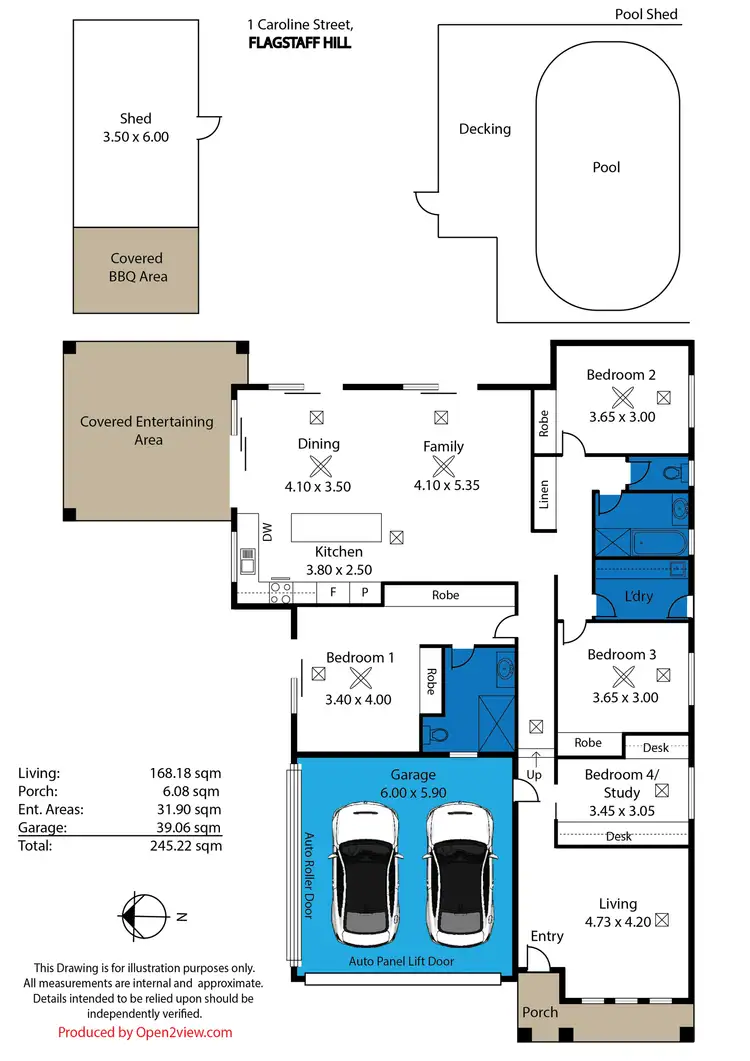 The outdoor area is designed for year-round enjoyment, featuring a paved all weather alfresco entertaining space with café blinds under the main roof, a solar-heated salt chlorinated swimming pool, paved all-weather barbecue area and generous size garden shed.