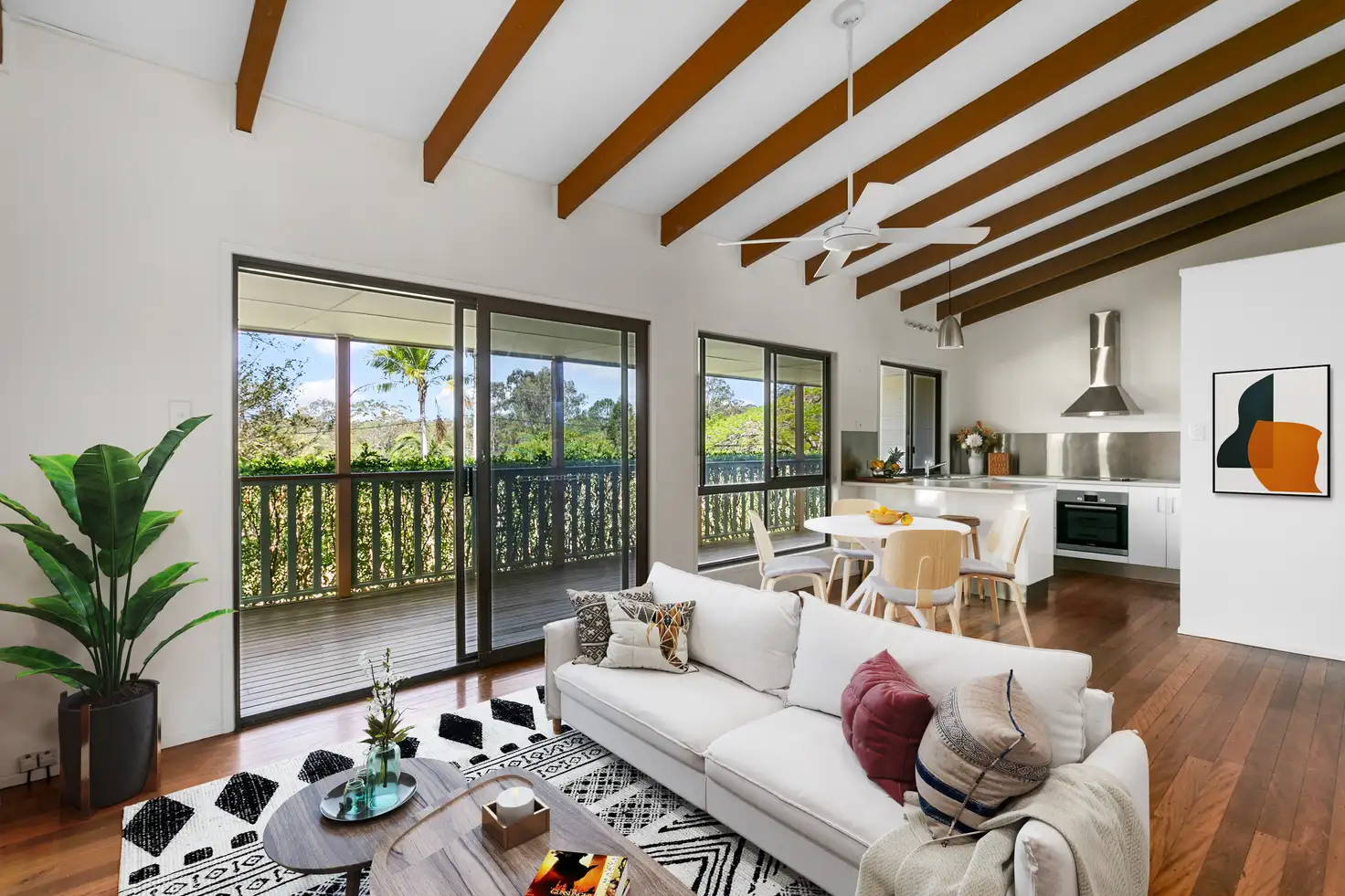 Cathedral ceilings with exposed beams in living/kitchen and hardwood timber floors throughout infuse the home with wonderful charm; other features include separate shower and bath, crimsafe screens on doors and windows, ceiling fans, direct balcony access from master bedroom, full termite barrier installed, and lock-up garden shed.