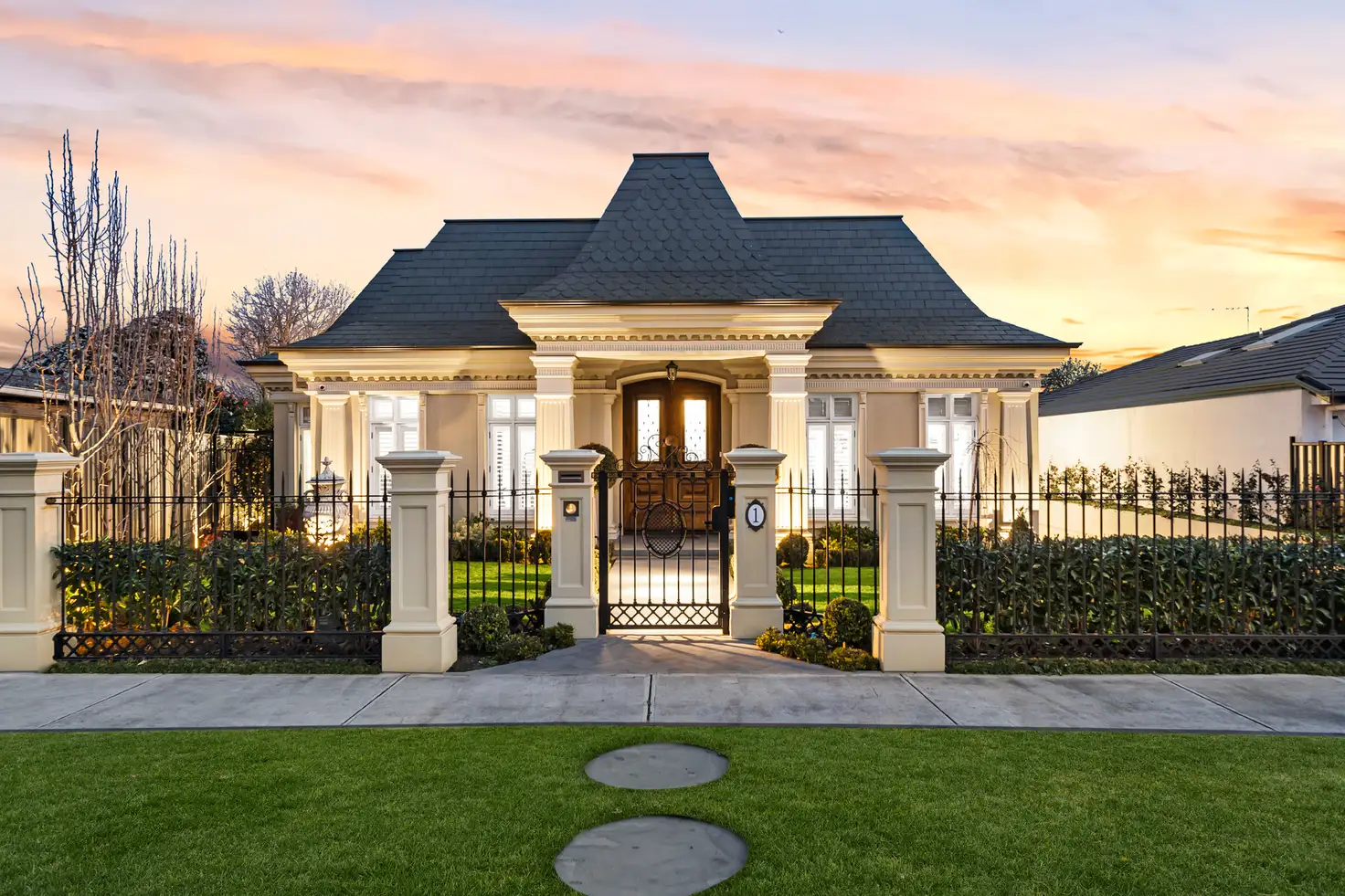 Inspired by French provincial charm, this 78-square home by renowned Essendon builder Bryce Kennedy, interiors by Dorothy de Guara offers multiple options for living according to the season and occasion. For entertaining family and friends, there is no better space than the expansive living zone, with herringbone-patterned oak floors under a majestic, coffered ceiling and a six-metre picture window framing an imported water feature beside the sparkling tiled pool. To one side, the chef's kitchen is a magazine-worthy depiction of provincial character layered over exceptional modern amenity. Workspaces fitted with Neff ovens, Bosch cooktop and Liebherr, Miele and Vintec refrigeration, and backed up by a butler's pantry, wrap the vast Calacatta marble island bench under a bespoke American pendant. Winter days and intimate soirees are catered for in the embrace of a sitting room warmed by a Heat & Glo fireplace set in an ornate marble mantel, refrigerated cooling and in-floor hydronic heating systems ensure year-round comfort. The two living rooms are complemented by a bluestone-paved verandah under a vaulted ceiling with built-in BBQ, French doors to both living zones and laundry/mudroom access, the alfresco space is both functional and relaxing. There's a calming ambience in the master suite, boasting a make-up nook, slate-grey Brintons carpet, motion-sensor lighting in the ensuite and walk-in wardrobe with island centrepiece. Two further stylish bedrooms each has a walk-in wardrobe and ensuite. The generous home office, one wall lined with display cabinetry, is a potential fourth bedroom. Anchoring the home's entry is a 2.2-metre-wide central hallway between the gently arched American oak double front doors and their scaled-down version leading to the rear living zone. On herringbone floors and adorned with pilasters, chandeliers and embossed Lincrusta dado panels, its elegance draws on the bespoke grandeur of the prominent façade. Below, via stairs or the lift, the 30-square basement offers six-car parking alongside dual spaces suitable for workshop, wine cellar, gym or storage. From the first impressions bestowed by its custom iron gate, handcut Spanish slate roof tiles and night-lit manicured garden, to every elegant interior detail under 3.2-metre ceilings, this is a one-of-a-kind residence. Only 11km from the city, its desirable locale is close to local shops/ cafes, Westfield, DFO, schools, transport and parks, including Moonee Ponds Creek Trail.