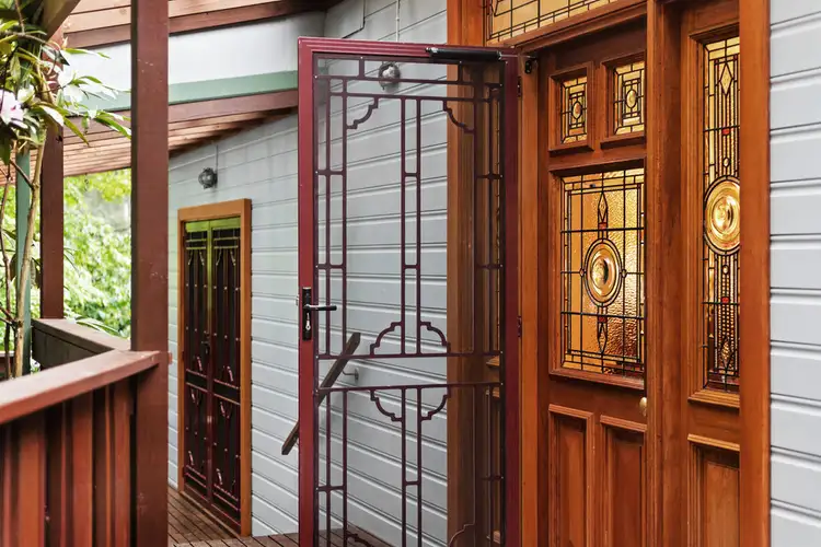 The home features three good sized robed bedrooms all with magnificent leafy outlooks, serviced by a splendid main bathroom with spa bath and exposed shower and tapware. The sumptuous master is particularly spacious with luxurious ensuite, mirrored robes, large windows overlooking the verdant front garden and French doors opening to serene veranda, a delightful place to enjoy your morning coffee. The fabulous expansive floorplan is complemented by old world character features and top quality appointments including elegant custom leadlight front door and side panels, lofty high ceilings, timber lining board walls and ceilings, sash windows, solid timber doors, French doors, double skinned polished hardwood floors, double glazed light wells, triple insulated blinds, gorgeous Pacific woodburning stove in the lounge room, gas ducted heating, split system, ceiling fans and twelve solar panels*