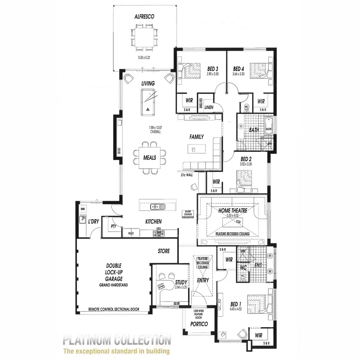 4. KITCHEN A display feature in its own right; the huge Island kitchen is a true statement of style and quality. The contrasting colour scheme of dark woods & white stone is subtle and chic and features plenty of cupboard space, 900mm appliances + rangehood; under-mounted cylinder sinks with Flickmaster tap, overhead cupboards, soft-closing drawers, pendant lighting, breakfast bar, shoppers entrance and commercial glass splashback.