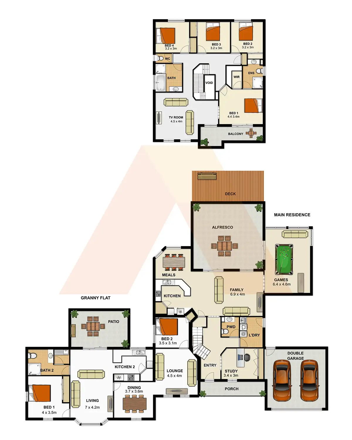 Granny Flat, Guest quarters the choice is yours, you could even rent it out to help pay off your home. With two bedrooms, bathroom and not just family meals, kitchen and laundry this even has formal lounge and formal dining. So much room and although it is attached to the main house totally seperate with the prevision that you could put a door in if you wanted to go from one to the other if needed.