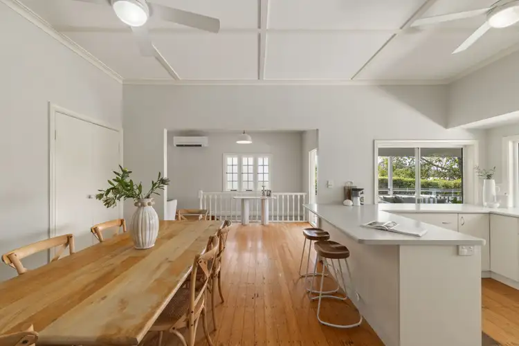 Showcasing timeless character with traditional timber floors, VJ walls, high ceilings, and casement windows, the upper floor transitions with ease from the living and dining areas into the well-appointed kitchen, which features a breakfast bar, dishwasher, and gas cooktop. Extending out to the expansive deck bathed in sunshine, and down to the patio, pool and yard below, the alfresco setting facilitates flawless entertaining and offers space for children and pets to play.