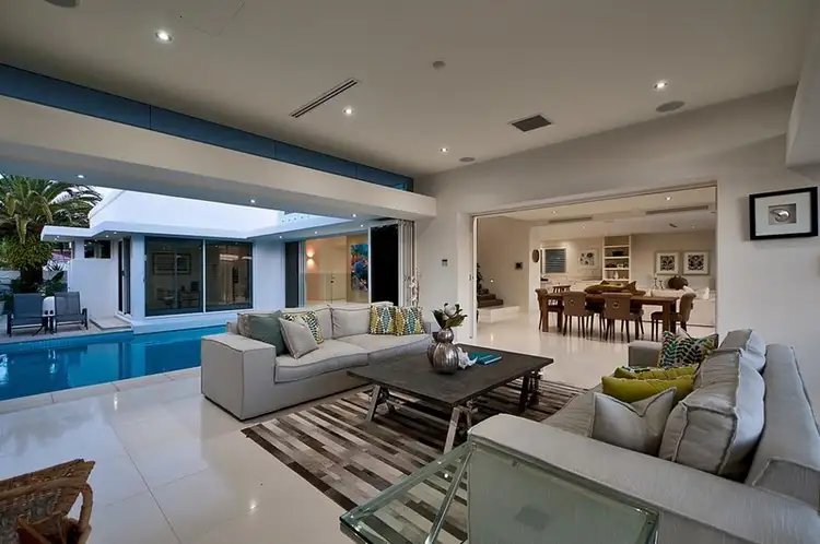 The designer Caesarstone island kitchen comes equipped with quality integrated appliances, including induction cooktop, both conventional and steam ovens, and soft-close cabinetry. Encapsulated within the centre of the home are the spacious open plan living and dining areas, enjoying direct patio access and breathtaking water views. A true oasis for entertaining family and friends, with an abundance of lifestyle options, including private swimming pool, covered patio, timber deck, waterfront spa and terraced outdoor lounge area.