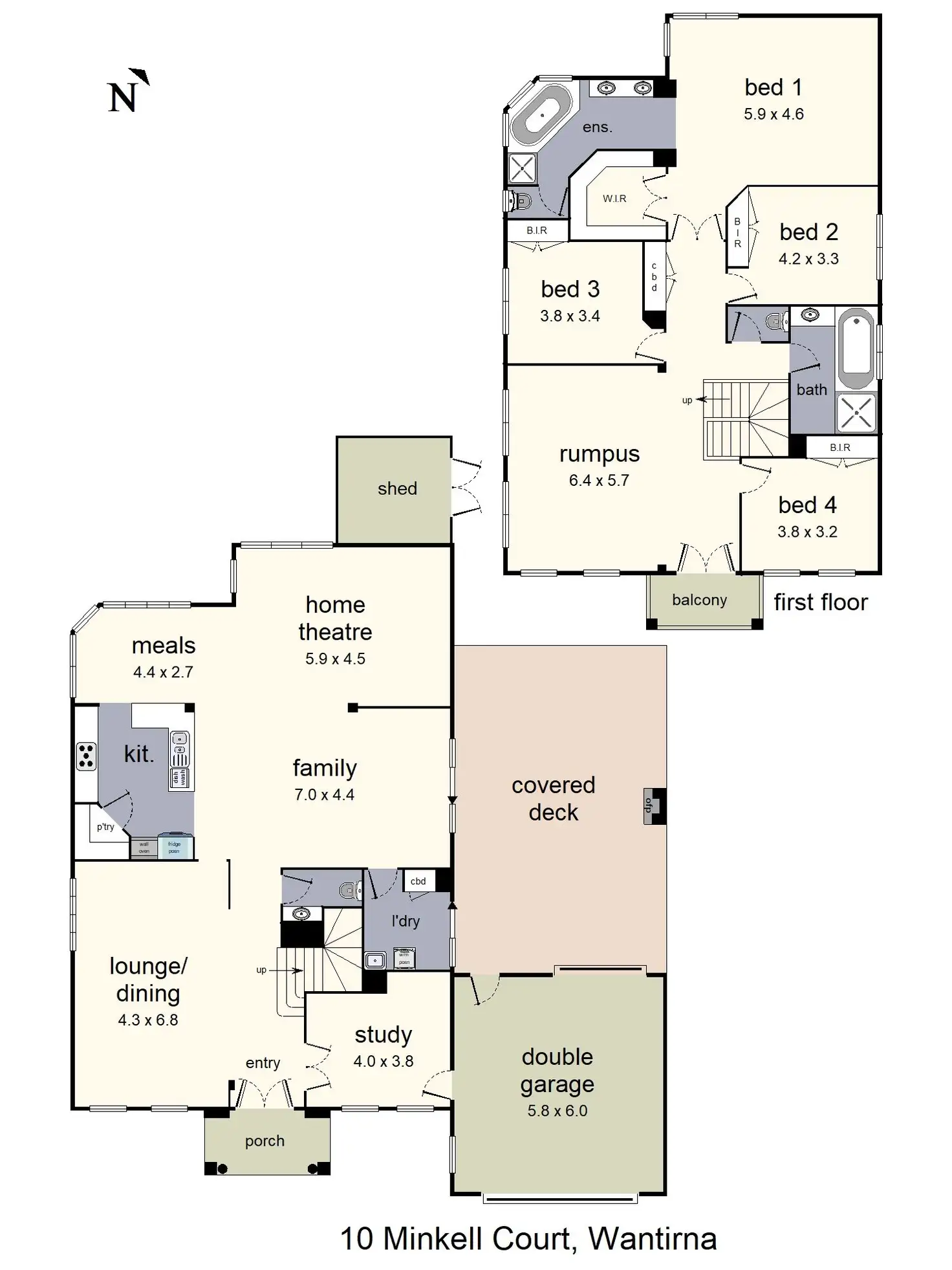 Additional highlights of the property include a study or potential fifth bedroom, a powder room, a laundry, and a range of modern conveniences such as ducted heating, evaporative cooling, ducted vacuum, alarm system, and keyless entry. High ceilings further enhance the sense of space and elegance. Outside, a garden shed adds practicality, while a double garage with internal access and rear roller door ensures convenience.