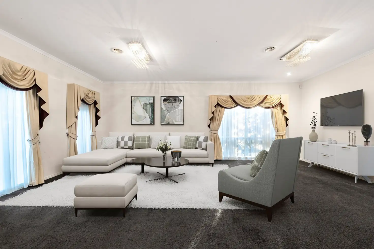 Upon entry, the grand double doors lead into a luxurious formal lounge, featuring plush carpeting for added comfort. Moving through the home, sleek tiles guide you to a spacious family room seamlessly connected to the well-appointed kitchen, complete with Miele appliances, a corner pantry, breakfast bar, and a convenient water point for the fridge. Adjacent to the kitchen is a dedicated dining area, enhancing the flow of the living space.
