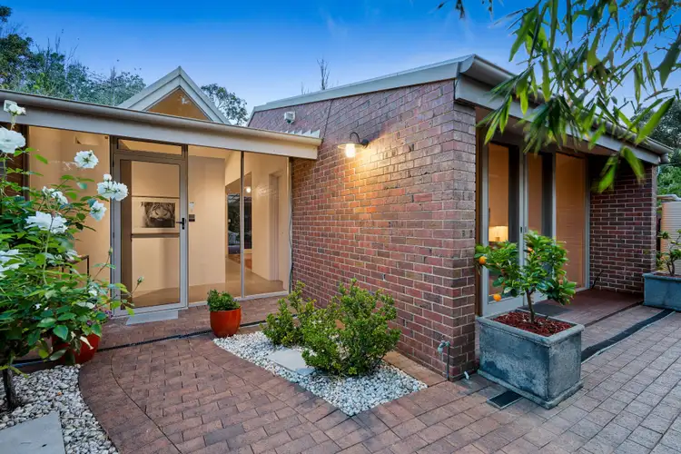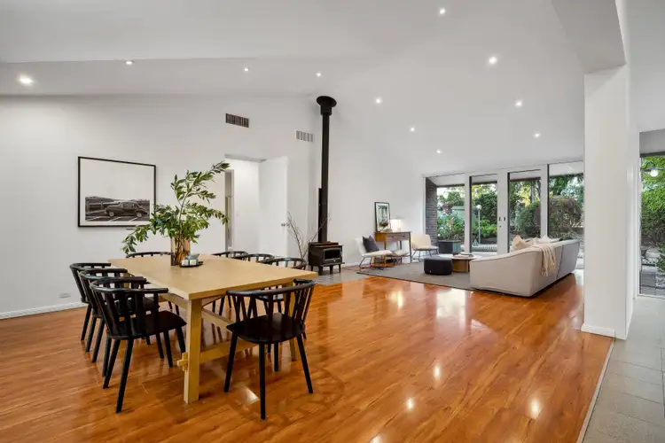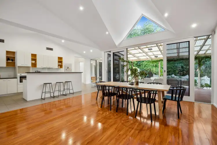From the entry, step into a dramatic open plan living space that is so easy to imagine furnishing your way - or filling it with your favourite people. High windows capture snapshots of the sky and trees above, with raked ceilings adding personality, and timber-framed sliding doors maximising the connection to your lush surrounds and the hints of the creek setting beyond.