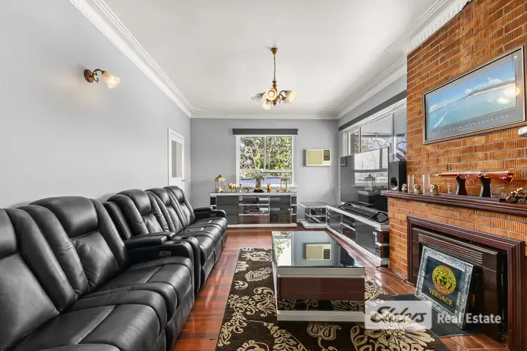 Step inside and be captivated by the grandeur of high ceilings and polished jarrah floorboards. Vintage white cornices add a touch of classic elegance throughout. To the left, a hallway leads you to four spacious bedrooms, each newly carpeted for comfort, and a strikingly modern bathroom. To the right, a choice awaits: enter your beautifully renovated kitchen and dining area, complete with reverse cycle air conditioning, or cozy up in the lounge room, the home's centrepiece. This space exudes warmth and inviting natural light, featuring a built-in woodfire place, mantelpiece, vintage cornices, and chandelier lighting.