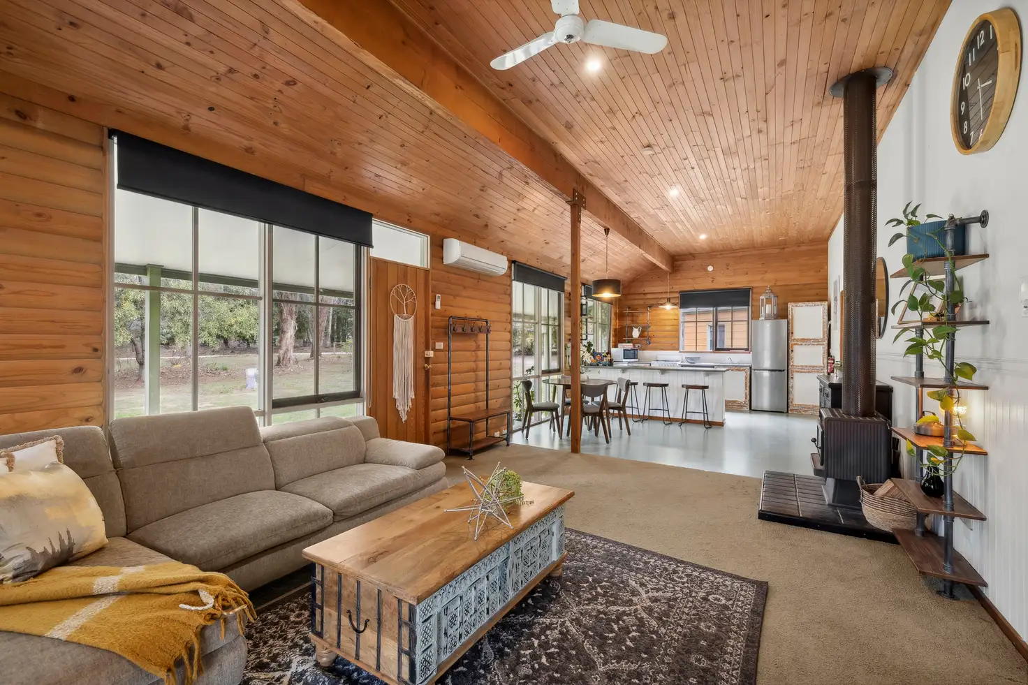 The main house is a character-filled log cabin featuring an open-plan living and dining room crowned with soaring ceilings. There's a cosy wood fire to warm your toes on chilly evenings, while air conditioning keeps you cool when the sun shines. Huge windows frame nature's ever-changing artwork, bringing the outdoors in and flooding the space with light. You can keep the natural pine aesthetic or opt for a Scandi-inspired transformation to make it truly your own. There's also a country-style kitchen with a dishwasher, two generous bedrooms with built-in robes, and a modern bathroom with laundry facilities. A massive undercover deck with a high-pitched roof means that alfresco entertaining and relaxation aren't just limited to fair weather days.