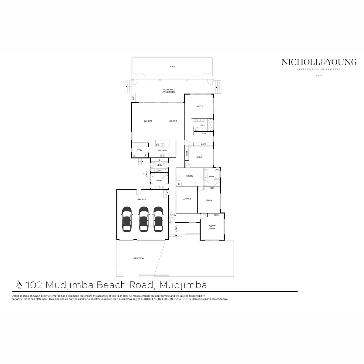 The rest of the home reveals four oversized bedrooms, including a master retreat with an enormous walk-in robe and a huge luxurious ensuite featuring twin basins and an enormous shower with a rain head. The master bedroom also offers delightful views of the pool and surrounding gardens, with direct access to the deck and pool. The guest suite provides beautiful views of the front tropical gardens.
