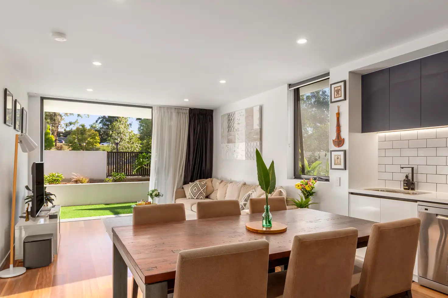 Upon entry you are immediately drawn to the open plan layout, filled with natural light and boasting quality timber flooring. The generously sized private alfresco courtyard flows from the air conditioned living area, perfect for those who love to entertain or simply just relax in the tranquil setting. The centrally located kitchen is ideal for entertaining and features stone bench tops, ample storage and stainless-steel Fisher & Paykel appliances.