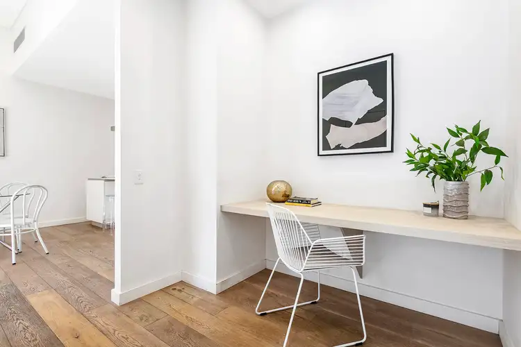 The sleek, modern kitchen features a gas cooktop, integrated fridge, dishwasher, microwave, and stone bench tops, while the internal laundry is complete with both washing machine and dryer. Two stylish bathrooms offer floor-to-ceiling tiling, frameless glass showers, and a bathtub in the main. Thoughtful extras elevate the lifestyle offering: a dedicated study nook, high ceilings, Haiku ceiling fans, wide oak timber floors, ducted air conditioning, secure basement parking with bike storage and generous storage cage.