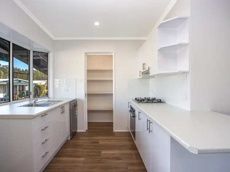 This home has been freshly renovated and features an open plan living design with raked ceilings, downlight and ceiling fans and laminate timber look flooring.