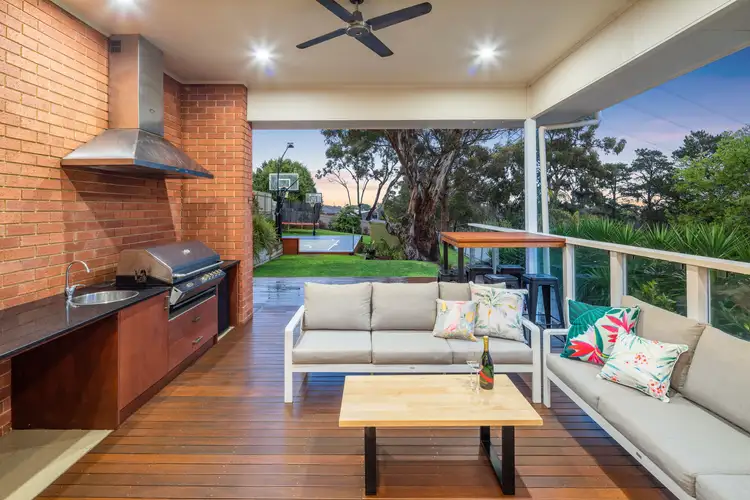 A beautifully crafted set of stairs from here will take you down a split-level to a spacious formal lounge with glass sliding doors opening out to a decked entertaining area showcasing a tranquil treetop view across the hills and valleys of Aberfoyle Park.