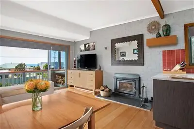 The ground floor of the home comprises a remote entry garage and workshop area, a double bedroom with built-ins (ideal for guest accommodation, a teen-age retreat or perfect for shift workers wanting a quiet room away from the main home) and a generous, modern combined bathroom/laundry (washing machine stays). Upstairs boasts sunny open plan living with sliding glass doors inviting the light and views, flowing through to the front deck overlooking the ocean (a great spot to relax or entertain), a bright new kitchen privy to lovely bushland views, offering ample bench and cupboard space with refrigerator included, another shiny new bathroom, master bedroom (overlooking the ocean) with built-in robes and a single bedroom also with built-in robes. The home is kept toasty warm throughout the winter season, courtesy of a built-in wood heater.
