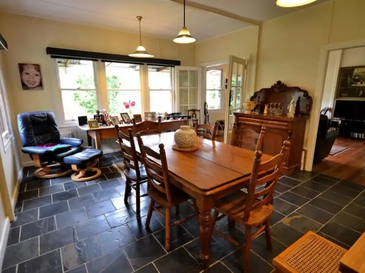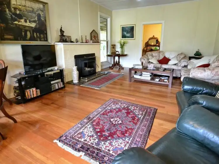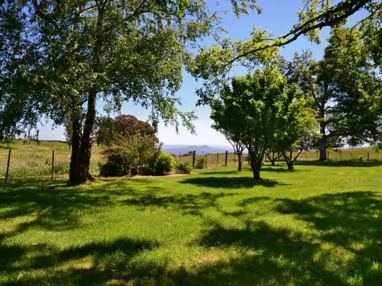 A true country style kitchen with extras, combines to a light filled dining room, overlooking the western hay paddock that also provides a stunning aspect to the valley below. Traditional lounge opens to dining and entry, enjoying rich, aged hardwood flooring, a cozy log fire, views of gardens & trees and French doors access the shady return verandah.