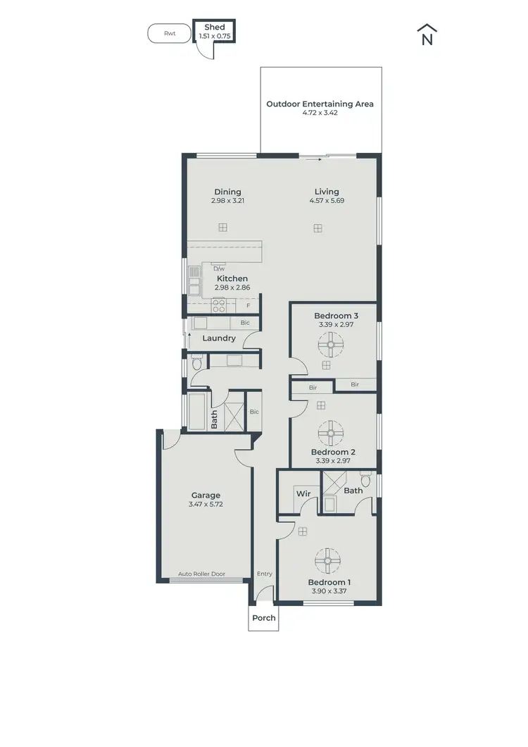 The master suite offers a peaceful retreat, complete with a walk-in robe and modern ensuite, while bedrooms 2 and 3 both feature built-in robes and ceiling fans. The sleek white bathrooms are fresh and functional, with quality fixtures and a timeless design.