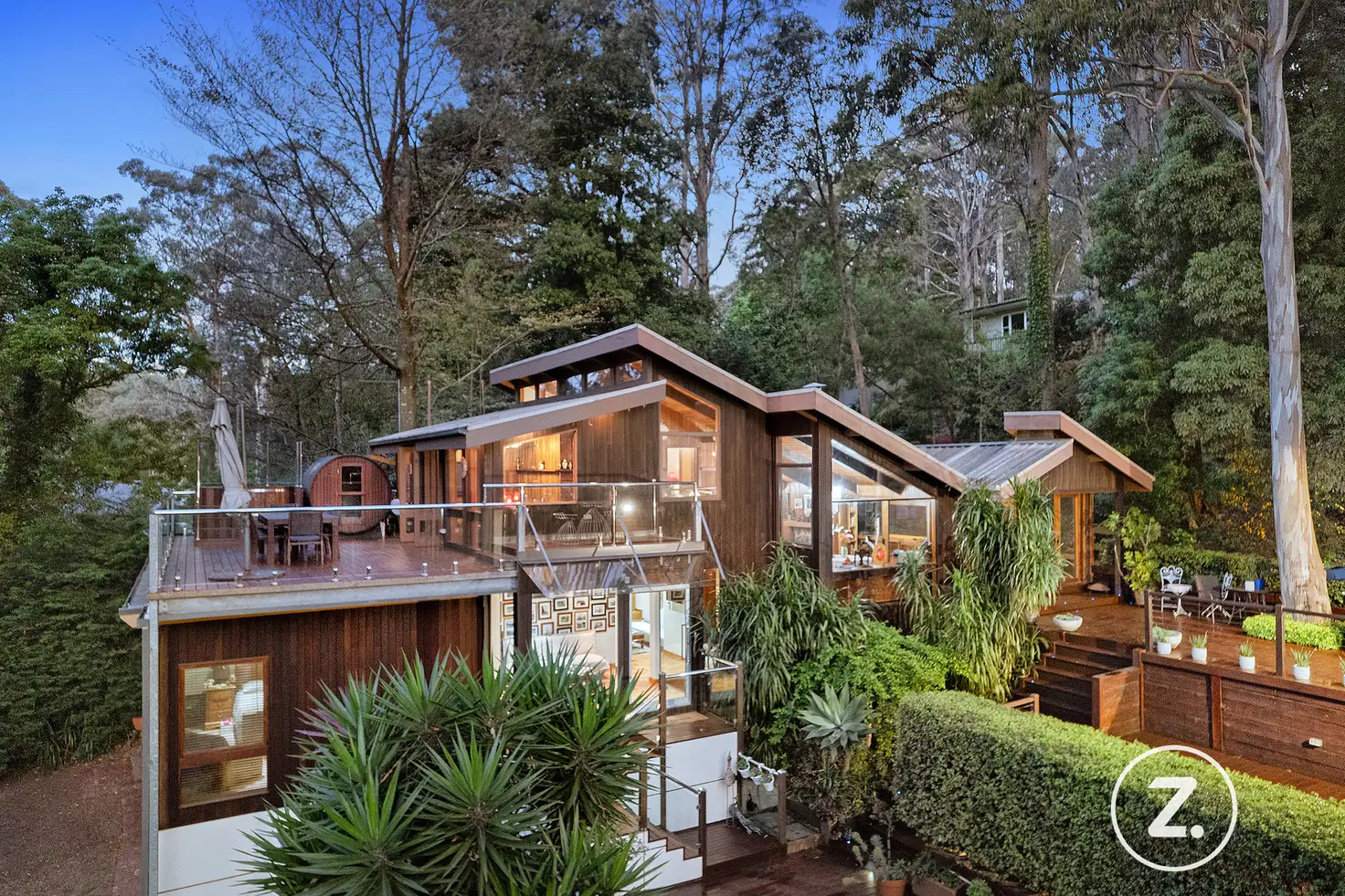 A long asphalt driveway leads to the two striking dwellings, seamlessly blending architectural beauty with the lush environment. The chalet-style home and apartment both feature a trio of terrace decks, offering filtered city views and luxurious spa and sauna facilities. Cathedral ceilings, expansive windows framing treetop vistas, and multiple levels define the bespoke design of the main residence, which boasts three spacious bedrooms with en-suites, a study or fourth bedroom, and an entertainer's dream with a large living room, a modern kitchen with stone finishes, and an adjoining BBQ deck.