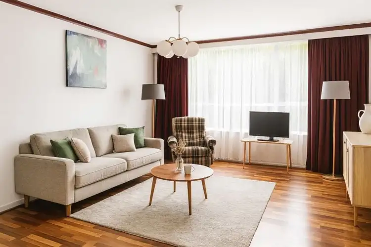 The apartment welcomes you with a generous living area that creates a warm and inviting atmosphere, complemented by a practical space heater for year-round comfort. The separate kitchen provides excellent functionality with ample space for a dining table, making meal preparation and casual dining a pleasure.