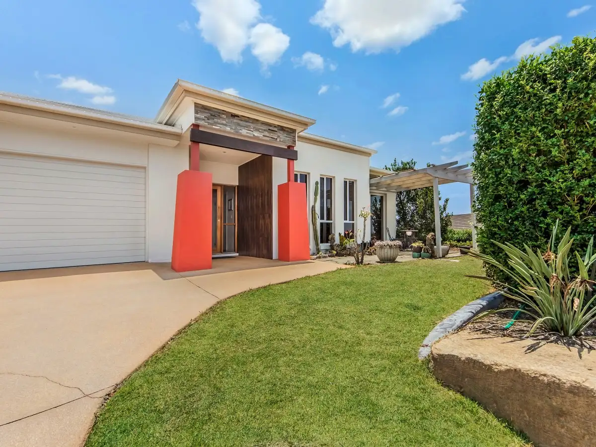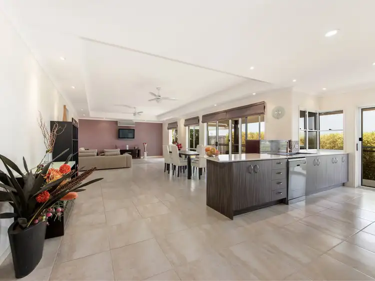 This is an Adenbrook home with some additional tweeks by the owner to give a personalized touch. It is a split level home with 7 timber steps separating the master suite from the rest of the home. The master suite is huge with his and hers walk in robes and the ensuite has a massive shower, dual basins, massive mirror and screened toilet. Beautiful tiles with features compliment the colour scheme. Continue up the 7 timber stairs to the delightful open plan kitchen, dining and casual living area. This is a light bright area with sliding doors and windows opening to the under cover patio. The plasma wall mounted TV will stay. The kitchen is impressive to any chef of the house.. Dual fuel 90 cm stove, large rangehood, timber grain cupboards and drawers, ceramic bench tops, dishwasher, 1 1/2 bowls sink, feature glass front doors on above bench cupboards, big fridge space, double door pantry and eating bar.