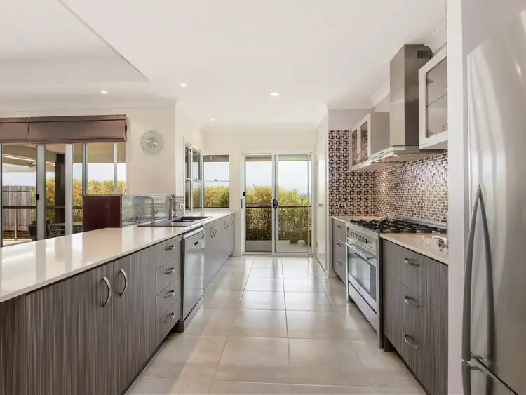 The splash back is glass feature tiles-- this is complimentary to the timber look cupboards and light contrast bench tops. Direct access through sliding doors to the patio for easy catering on the deck.