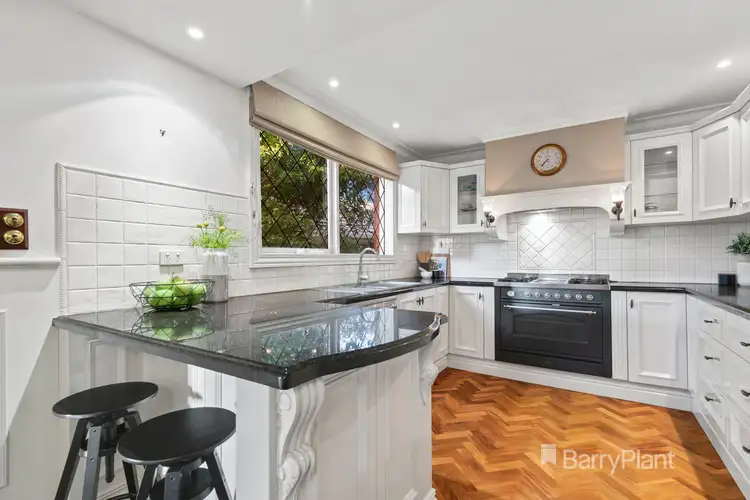 The classically designed kitchen offers detailed white cabinets and black granite benchtops with well-appointed European appliances. Its parquetry floorboards add to the character of this cooking space. This stylish kitchen spans through to a huge meal zone, which flows through to the grand north-facing family room detailed with leadlight windows and a split system air conditioner. Bifold doors, through the meals area, open out to an alfresco oasis of entertaining deck, surrounded by luscious palm trees. A perfect venue for entertaining or relaxing, overlooking an easy-care garden.