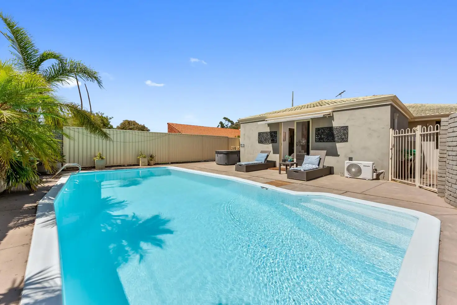 ... is the private and secure front below-ground swimming pool that makes an instant first impression, along with a bubbling outdoor spa that has access to a long side patio area for covered entertaining