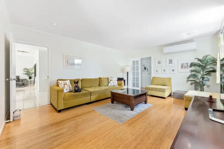 ... is a large formal front lounge room with gleaming Bamboo floorboards, split-system air-conditioning and a gorgeous French door leading through to the minor sleeping quarters, right next to a flexible library/sitting area, or formal dining room with book shelving