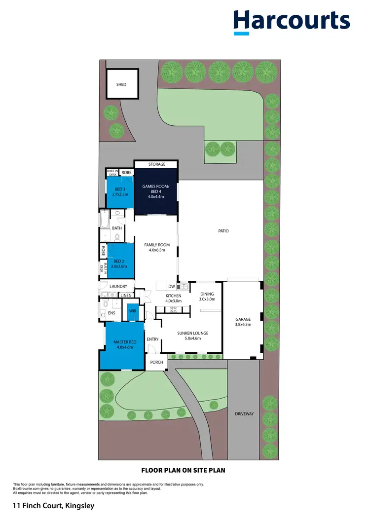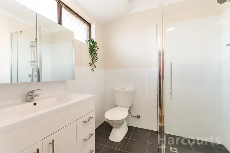 The generous master bedroom serves as a serene retreat, featuring a walk-in robe, roller blinds, and sliding door access to a private courtyard. Its accompanying ensuite offers convenience and simplicity. Two additional bedrooms include built-in robes and desks, while the sunken fourth bedroom offers flexibility as a multi-purpose living space with access to a massive outdoor entertaining area under a pitched patio. All bedrooms are generously sized.