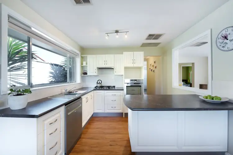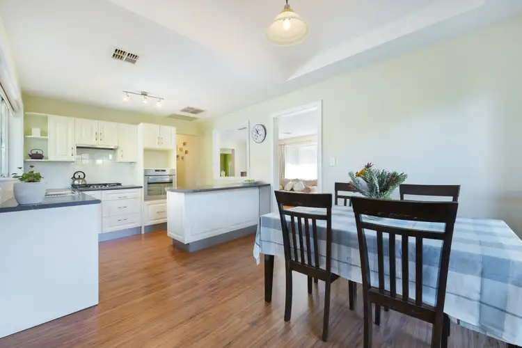 To the left of the property is the formal lounge room which overlooks the front garden. Feature light fittings and quality flooring give this space a modern and trendy vibe. To the rear of the home is the open plan dining and kitchen area which is certainly large enough to host the whole family. The kitchen in particular has been brilliantly renovated - light cabinetry and dark bench tops tie in beautifully with the other modern updates in the home. As well as ample bench and cupboard space, the kitchen features a charming servery that leads out to the living area, a sizable island, feature light fittings and a convenient breakfast bar. For optimum temperature control all year round, the home is fitted with ducted evaporative cooling and ducted gas heating throughout.
