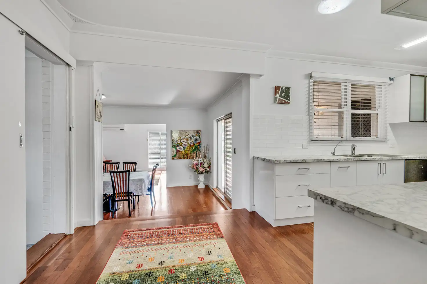 The heart of the home, the stunning modern, sleek bright kitchen with views across the rear of the block. Soft closure cabinetry, loads of draws to store your cookware, new stainless white goods, double sink with lots of bench space and a large pantry to fill. The home had a tasteful extension added and the floorboards were continued through the home to the step-down open plan dining lounge room complete with reverse cycle air at your fingertips. The feature panel wall is understated and stunning, perfect to frame that statement art piece. Enjoy the view, whether it's watching the kids in the backyard or a spot of bird watching, the floor to ceiling windows creates the peacefulness we all desire.
