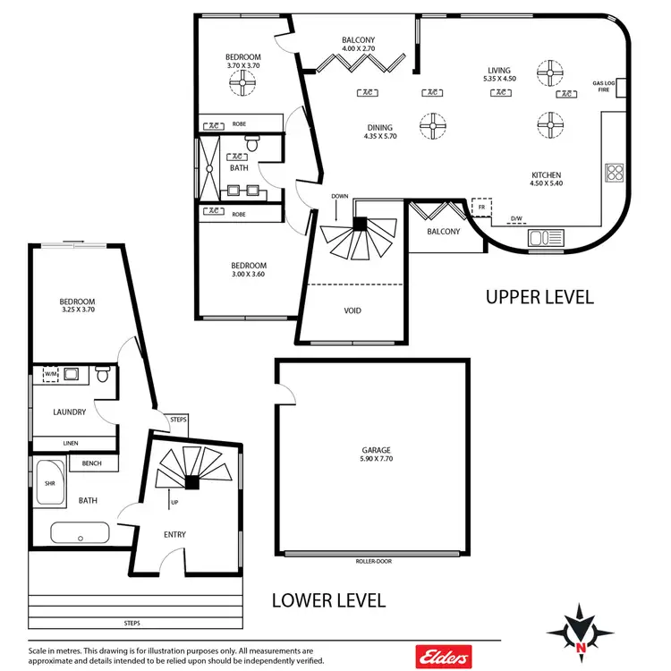 Stainless steel ceiling fans in living and bedrooms, accompanied by a gas log fire in the living area