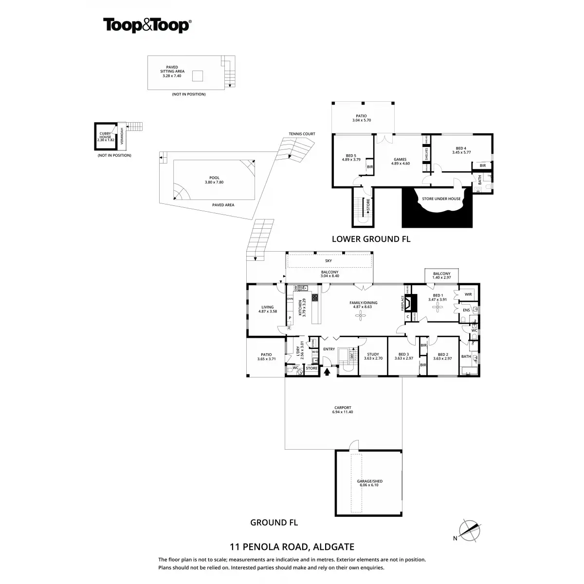 A floor plan comprising 5 large bedrooms plus study, three separate living areas and three bathrooms over two levels. Perfect for those working from home, the study is tucked away from the living spaces off the entry. From the entry you can head downstairs or through to the open plan kitchen/family meals area. With pitched roof, downlights and floor to ceiling windows the living spaces are light and airy and look out to the lovely garden and deck. The covered deck is the perfect vantage point to take in the beautiful green garden views and outlook over the pool and onto the full sized tennis court.