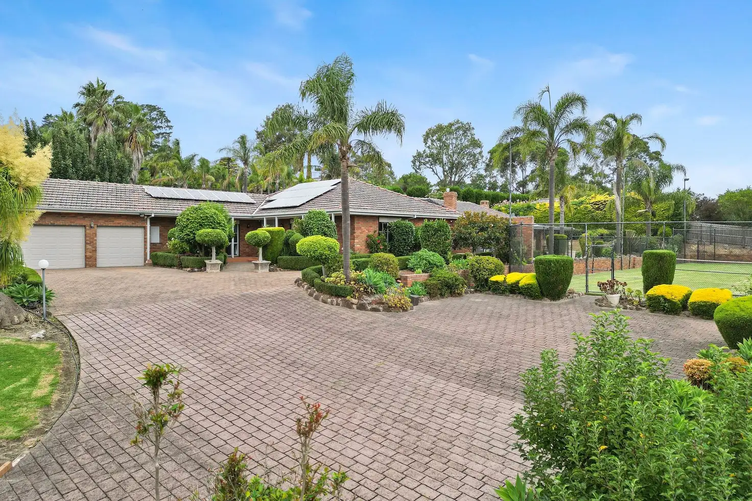 Stepping outside, a covered alfresco terrace seamlessly extends the living areas, flowing effortlessly onto a sparkling pool—the perfect setting for year-round entertaining. The north-south, flood-lit mod-grass tennis court ensures endless recreation, while the manicured gardens provide a picturesque and private sanctuary.