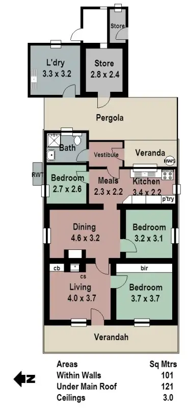 Internally this petite haven has been splashed with a blend of fresh country white and earthy tones. Ideal for two or three, the master bedroom sits to the front opposite the living area, the second bedroom adjacent, whilst the third bedroom flows from the kitchen and meals area, ideal for use as a home office or study. Rich floorboards create a feeling of space and work nicely with the floor plan to draw your eye throughout the home. The wet area has been outfitted to provide a clean modern finish, featuring a pedestal basin, shower and toilet.