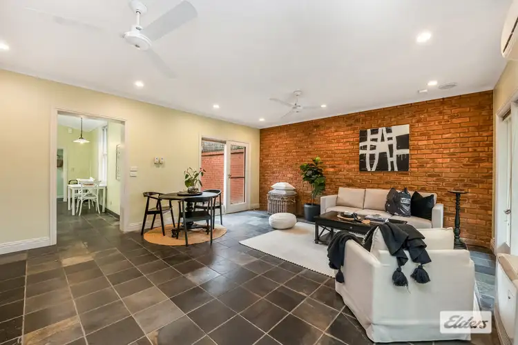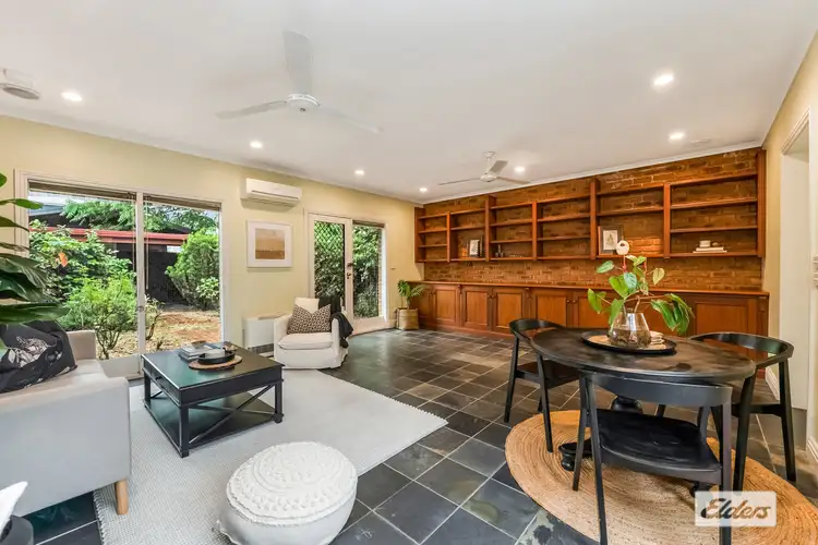 Inside, the home boasts high ceilings and period detailing, creating a sense of timeless character. At the front, a cosy bedroom with built in robes provides a quiet retreat, while a versatile second living space with timber floors and built in shelving offers the flexibility to serve as an additional bedroom. Toward the rear, the lounge blends rustic charm with functionality, featuring exposed brick walls, slate flooring, and generous cabinetry. Large windows and glass doors overlook the private courtyard, bathing the space in natural light. The existing layout provides a solid foundation with the potential to reimagine the spaces to suit your lifestyle.