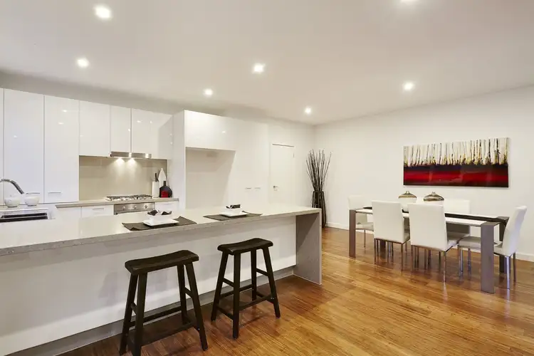 Further notable inclusions list as; split system heating and cooling, upper study nook, a sophisticated laundry fitted with stone benchtops and soft-closing storage, plus a guest powder room and off-street parking for a second vehicle.