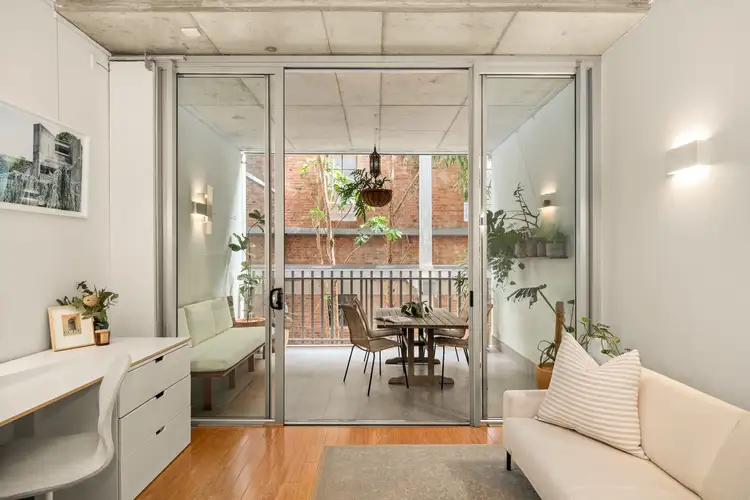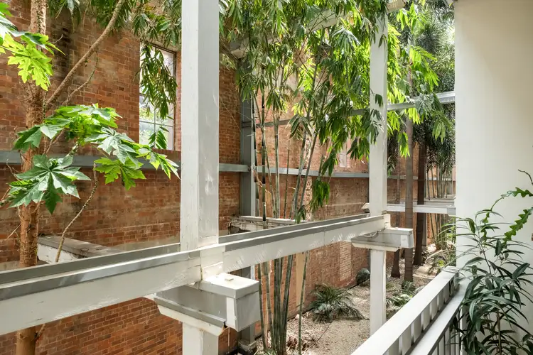 Capturing a peaceful aspect with exposed brickwork and greenery, the interiors are a carefully considered blend of original and updated features. Kept in neutral tones, the warmth of the timber floor and cabinetry complements the exposed concrete ceiling, creating a minimalistic yet welcoming ambience.