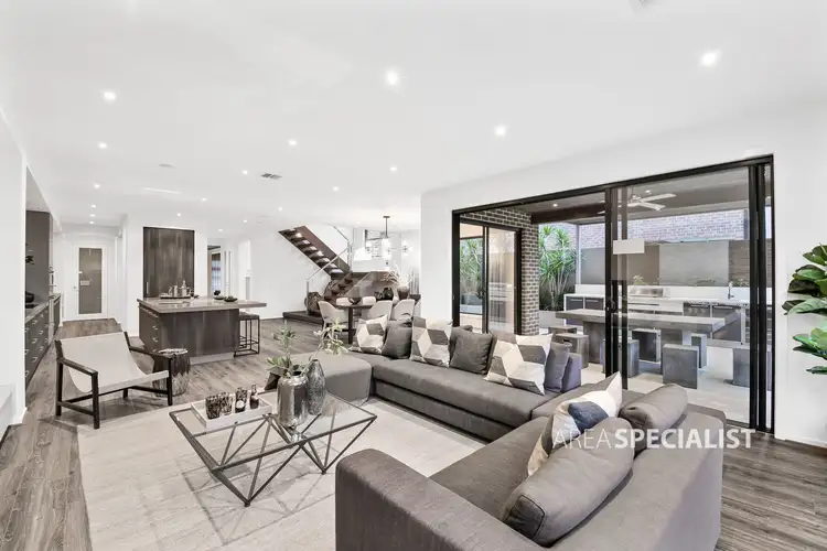 Beautifully landscaped gardens adorn the modern facade and a full height glazed entry sets the tone for this sleek, light filled residence. Downstairs comprises of a formal living room, well-positioned home office, open plan kitchen, meals and family area, guest powder room and laundry. The extravagant kitchen affords stone benchtops, window splashback, 3 ovens, a built-in coffee machine, induction cooktop and dishwasher. Continuing the dream design is a generous butlers pantry with wine cellar and handy access to the double garage.