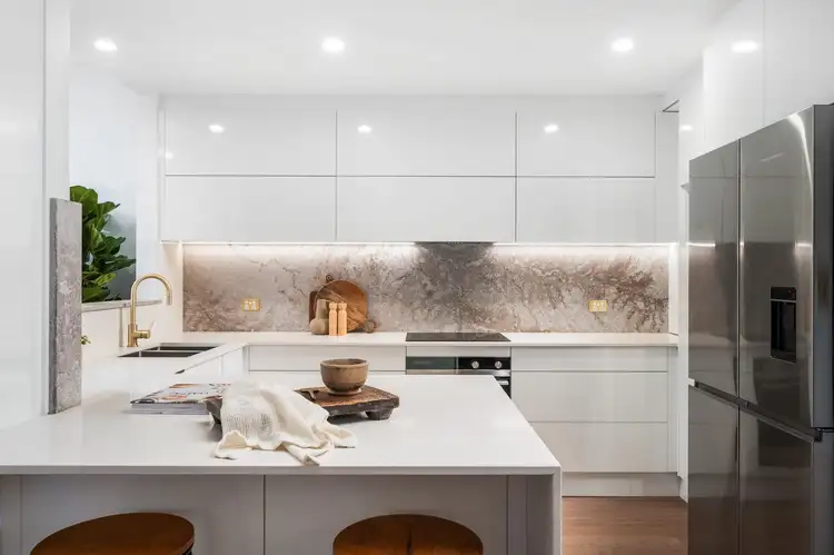 - Contemporary kitchen, stone benches, electric cupboard doors, oodles of clever storage