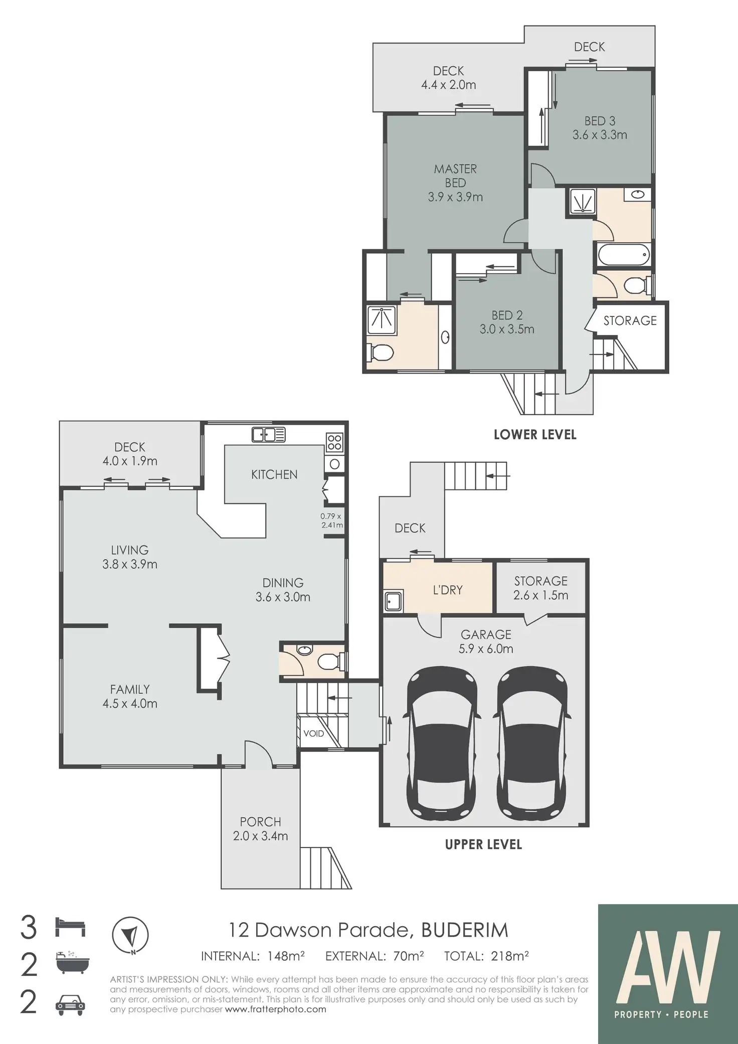 Across two levels, the home comprises formal entry, three bedrooms, two bathrooms, powder room, two separate living areas, central kitchen with ocean views from sink, timber decking on both levels, separate laundry with external access to private drying deck, and double lock-up garage with storage.